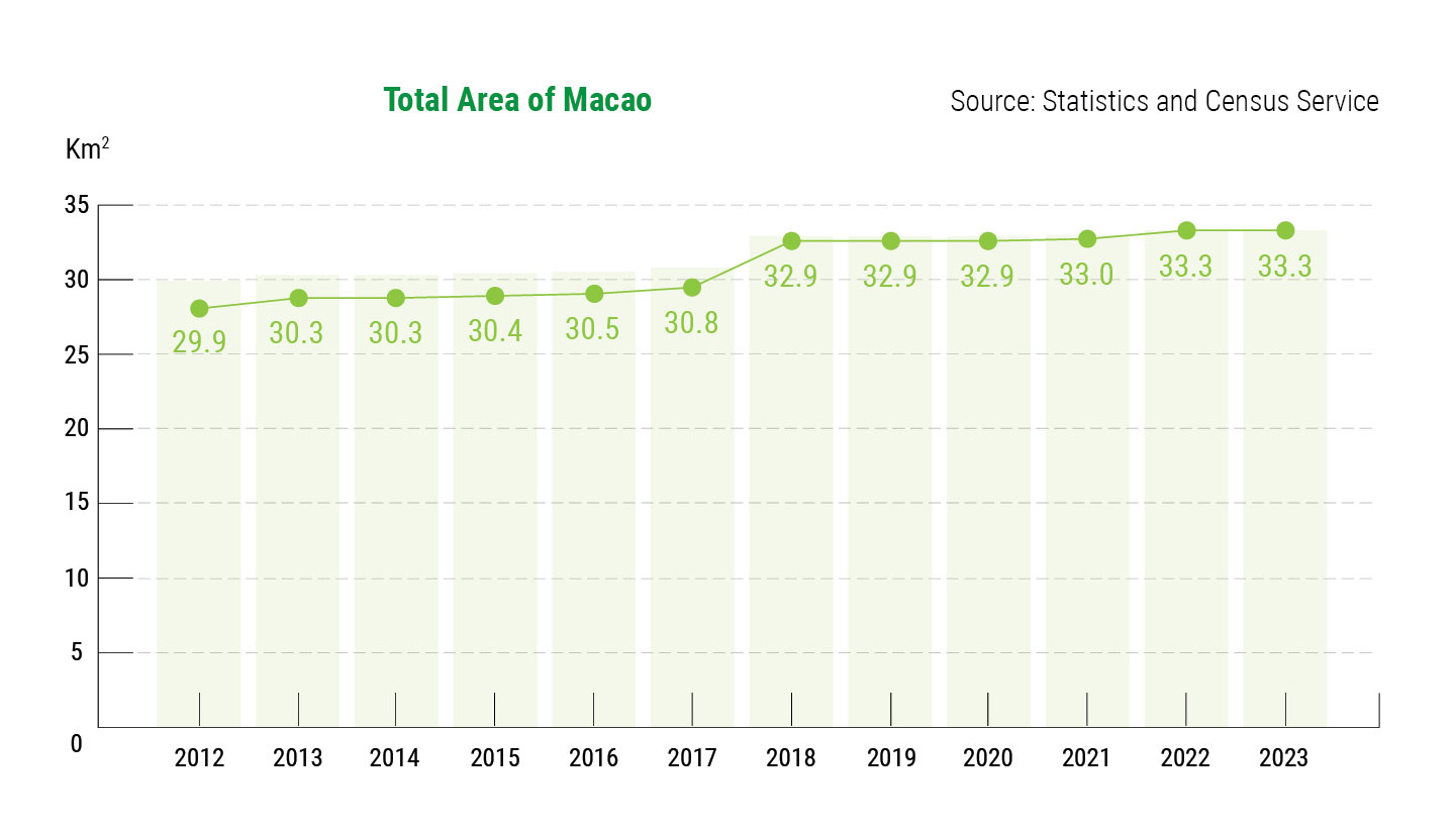 Площадь Макао увеличилась в три раза за счет мелиорации земель. Первоначальная территория Макао включала полуостров Макао, включая прибрежный остров Илья-Верде, а также южные острова Тайпа и Колоан. Каждая из этих территорий была расширена за счет мелиорации. Кроме того, освоение территории Котай между Тайпой и Колоаном объединило их в единый массив суши.